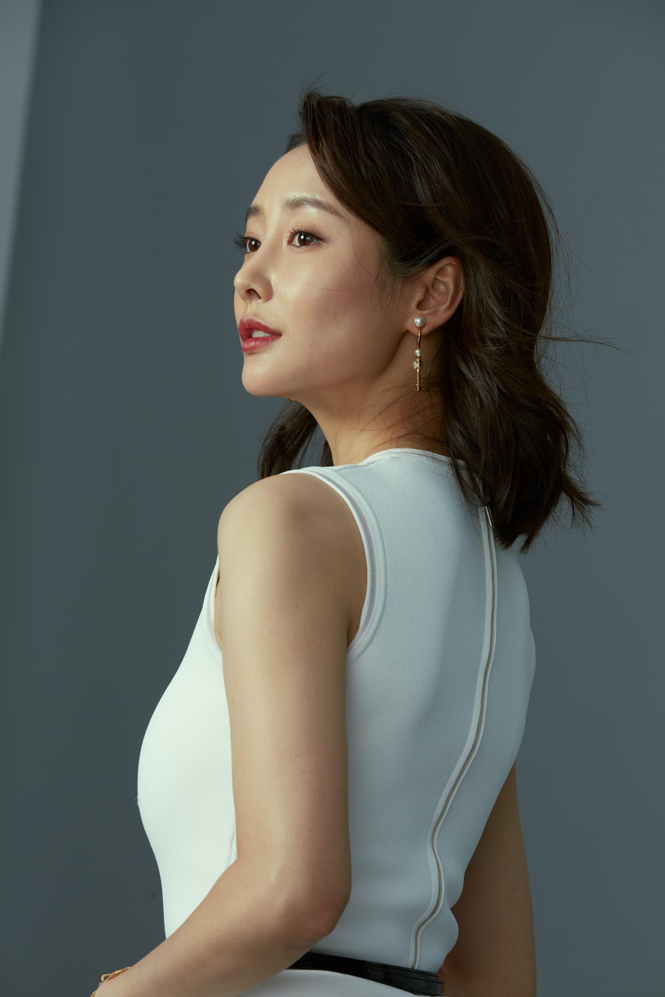 李纯侧身立于光影之中,白色长裙勾勒出流畅的腰臀曲线,微卷长发自然垂落肩侧,眼神宁静望向远方